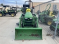 2014 JOHN DEERE 1025R TRACTOR LOADER BACKHOE, 60D AUTO CONNECT MOWER DECK, R4 INDUSTRIAL TIRES, 2 FUNCTION JOYSTICK AND H120 FRONT LOADER WITH 51" FRONT BUCKET, POWER STEERING, REAR 540 PTO, Before driving to see this item, please call or email to confirm availability.